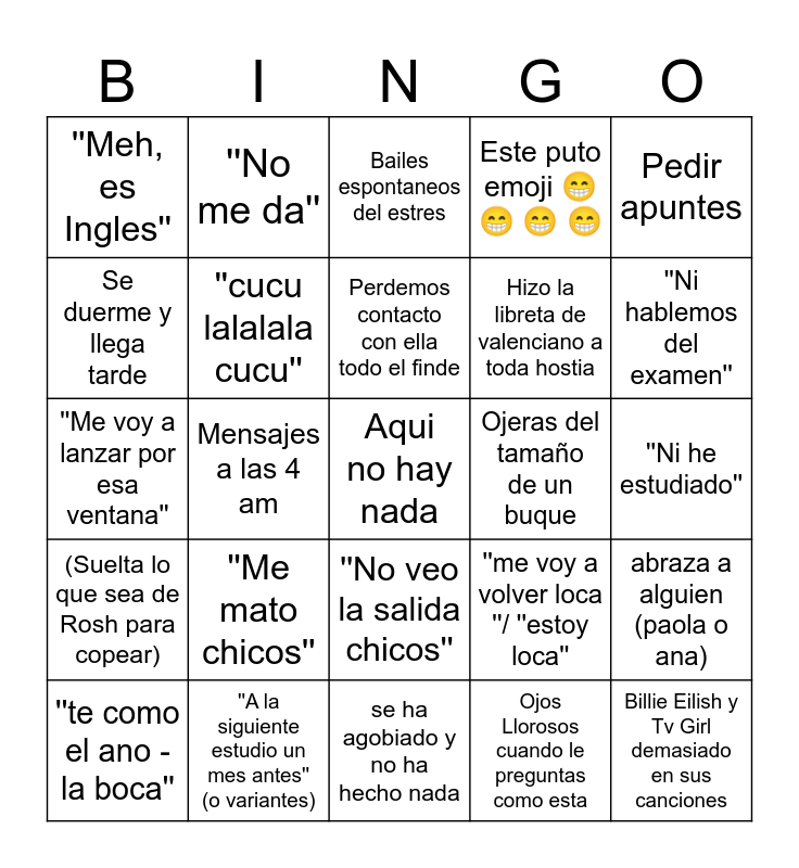 This bingo card has a free space and 24 words: ''Me mato chicos'', ''A la siguiente estudio un mes antes'' (o variantes), Perdemos contacto con ella todo el finde, ''te como el ano - la boca'', Pedir apuntes, ''Meh, es Ingles'', Se duerme y llega tarde, ''No me da'', Ojeras del tamaño de un buque, ''No veo la salida chicos'', Hizo la libreta de valenciano a toda hostia, ''Me voy a lanzar por esa ventana'', ''me voy a volver loca ''/ ''estoy loca'', abraza a alguien (paola o ana), ''cucu lalalala cucu'', Ojos Llorosos cuando le preguntas como esta, ''Ni he estudiado'', Bailes espontaneos del estres, ''Ni hablemos del examen'', Mensajes a las 4 am, Billie Eilish y Tv Girl demasiado en sus canciones, (Suelta lo que sea de Rosh para copear), Este puto emoji 😁 😁 😁 😁 and se ha agobiado y no ha hecho nada.