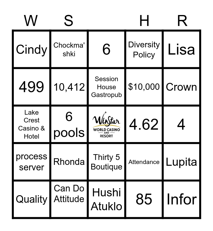 This bingo card has a free space and 24 words: Rhonda, Can Do Attitude, Session House Gastropub, Quality, Lisa, Cindy, 499, Chockma' shki, 4.62, Thirty 5 Boutique, $10,000, Lake Crest Casino & Hotel, Attendance, Lupita, 10,412, 85, 4, 6, Crown, 6 pools, Infor, process server, Diversity Policy and Hushi Atuklo.