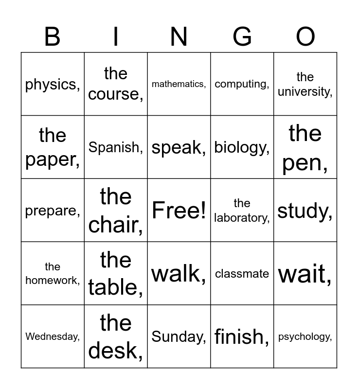 This bingo card has a free space and 86 words: Dance,, search,, walk,, sing,, buy,, answer,, converse, rest,, desire,, draw,, teach,, listen,, wait,, study,, explain,, speak,, arrive,, take,, look,, need,, practice, ask,, prepare,, return,, finish,, take,, work,, work,, travel,, the draft,, the desk,, the book,, the marker,, the table,, the paper,, the blackboard,, the pen,, the door,, the clock,, the chair,, the window,, the library,, the stadium,, the laboratory,, the student residence,, the university,, the class,, the course,, the exam,, the schedule,, the test,, the semester,, the homework,, the quarter,, the art,, business administration,, accounting,, biology,, computing,, Spanish,, physics,, Geography,, history,, English,, foreign languages,, mathematics,, journalism,, psychology,, chemistry,, sociology,, Monday,, Tuesday,, Wednesday,, Thursday,, Friday,, Saturday,, Sunday,, the week,, today is,, the cafeteria,, the cafeteria,, the library,, bookstore, classroom, classmate and the roommate..