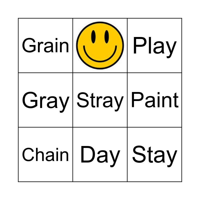 This bingo card has 1 images and 8 words: Chain, Stray, Play, Grain, Paint, Gray, Day and Stay.