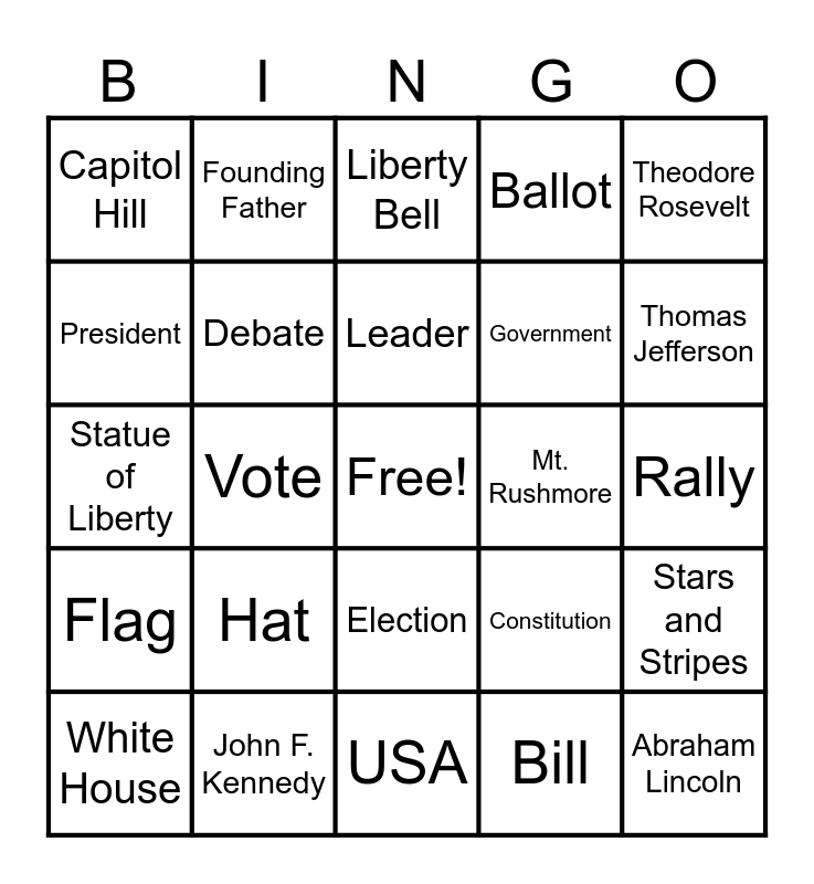 This bingo card has a free space and 29 words: White House, George Washington, Vote, Speech, Capitol Hill, Liberty Bell, Debate, Hat, Mt. Rushmore, John F. Kennedy, Rally, Abraham Lincoln, USA, Bill, Thomas Jefferson, Eagle, Election, Flag, Theodore Rosevelt, Statue of Liberty, Constitution, Colonies, Government, President, Ballot, Founding Father, Stars and Stripes, Leader and Patriot.