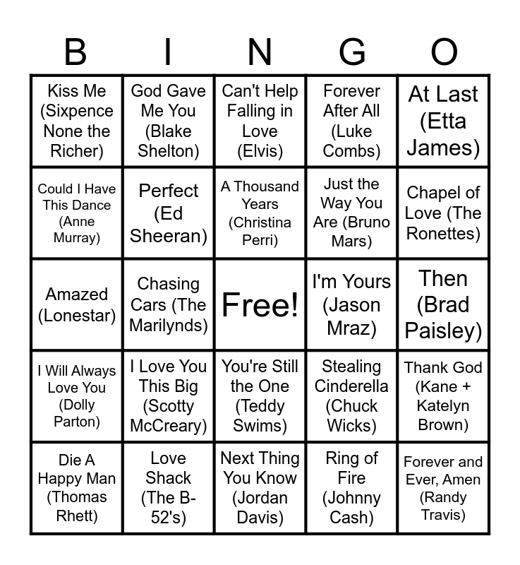 This bingo card has a free space and 60 words: I Wanna Dance with Somebody (Whitney Houston), Love Shack (The B-52's), A Thousand Miles (Vanessa Carlton), I Will Always Love You (Dolly Parton), Ring of Fire (Johnny Cash), I Can't Help Myself *Sugar Pie, Honey Bun* (Four Tops), Perfect (Ed Sheeran), All of Me (John Legend), Just the Way You Are (Bruno Mars), Marry Me (Train), Forever After All (Luke Combs), Love Story (Taylor Swift), Could I Have This Dance (Anne Murray), You're the One That I Want (John Travolta + Oliva Newton-John), What Makes You Beautiful (One Direction), Kiss Me (Sixpence None the Richer), Forever and Ever, Amen (Randy Travis), At Last (Etta James), You Make My Dreams Come True (Daryl Hall + John Oate), A Thousand Years (Christina Perri), I'm Yours (Jason Mraz), Can't Help Falling in Love (Elvis), Die A Happy Man (Thomas Rhett), Thank God (Kane + Katelyn Brown), My Best Friend (Tim McGraw), She's Everything (Brad Paisley), Livin' On Love (Alan Jackson), Remember When (Alan Jackson), Chapel of Love (The Ronettes), Dilemma (Nelly), Thinking Out Loud (Ed Sheeran), Can't Take My Eyes Off You (Frankie Valli), From the Ground Up (Dan + Shay), Bless the Broken Road (Rascal Flatts), God Gave Me You (Blake Shelton), I Run to You (Lady A), Islands in the Stream (Dolly + Kenny), Chasing Cars (The Marilynds), Greatest Love Story (LANCO), Amazed (Lonestar), Love Like Crazy (Lee Brice), I Love You This Big (Scotty McCreary), Then (Brad Paisley), Young Love (The Judds), Stealing Cinderella (Chuck Wicks), You and Me (Lifehouse), From This Moment On (Shania Twain), Wonderful Tonight (Eric Clapton), I Get to Love You (Ruelle), You're Still the One (Teddy Swims), Next Thing You Know (Jordan Davis), I Can Love You Like That (John Michael Montgomery), This Will Be (Natalie Cole), The Time of My Life (Bill Medley + Jennifer Warnes), L-O-V-E (Nat "King" Cole), I Don't Want to Miss a Thing (Aerosmith), Everything I Do, I Do It For You (Bryan Adams), But I Do Love You (LeAnn Rimes), Let's Make Love (Tim McGraw + Faith Hill) and Holding out for a Hero (Bonnie Tyler).
