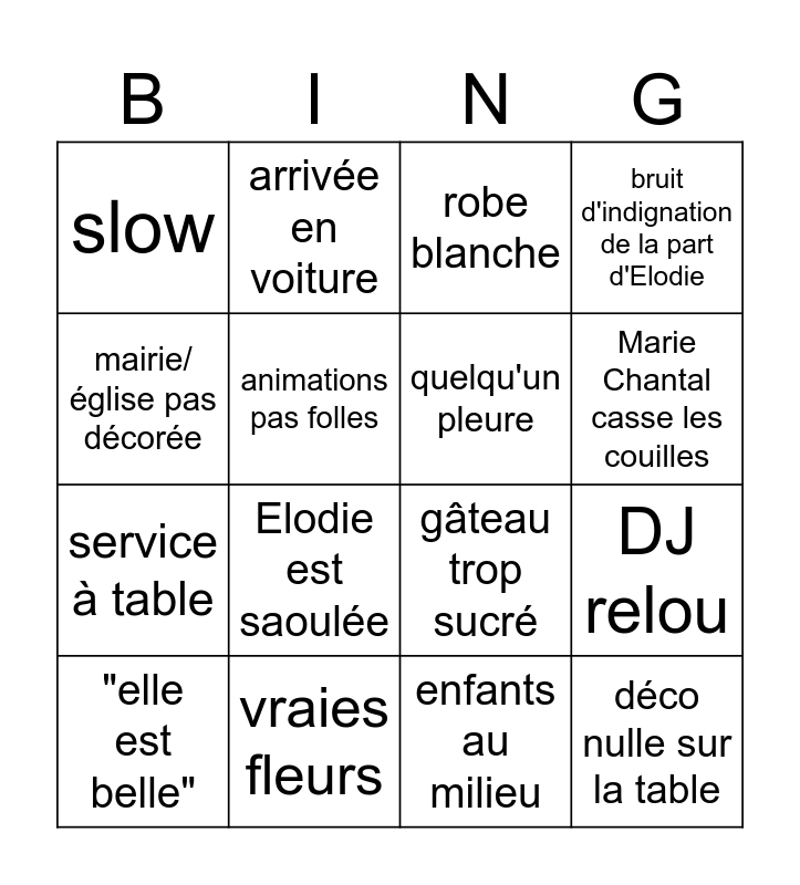 This bingo card has 16 words: vraies fleurs, DJ relou, robe blanche, slow, service à table, arrivée en voiture, gâteau trop sucré, enfants au milieu, mairie/église pas décorée, animations pas folles, "elle est belle", bruit d'indignation de la part d'Elodie, Elodie est saoulée, Marie Chantal casse les couilles, quelqu'un pleure and déco nulle sur la table.