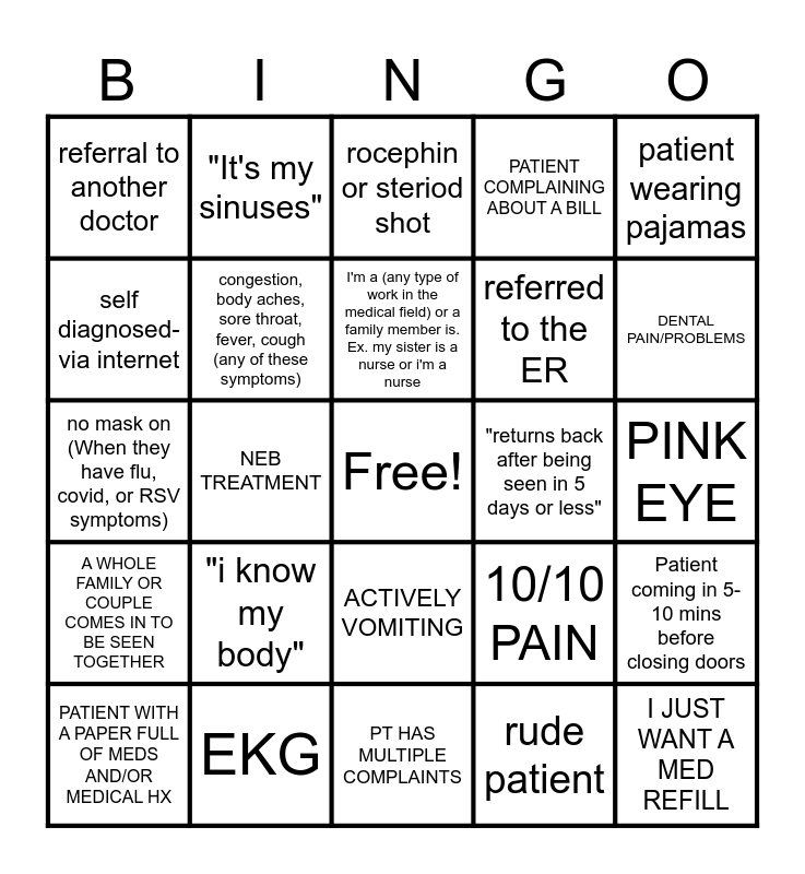 This bingo card has a free space and 24 words: "i know my body", EKG, I'm a (any type of work in the medical field) or a family member is. Ex. my sister is a nurse or i'm a nurse, PATIENT WITH A PAPER FULL OF MEDS AND/OR MEDICAL HX, patient wearing pajamas, referral to another doctor, self diagnosed-via internet, "It's my sinuses", "returns back after being seen in 5 days or less", ACTIVELY VOMITING, referred to the ER, no mask on (When they have flu, covid, or RSV symptoms), 10/10 PAIN, Patient coming in 5-10 mins before closing doors, congestion, body aches, sore throat, fever, cough (any of these symptoms), rude patient, PINK EYE, rocephin or steriod shot, DENTAL PAIN/PROBLEMS, NEB TREATMENT, I JUST WANT A MED REFILL, A WHOLE FAMILY OR COUPLE COMES IN TO BE SEEN TOGETHER, PATIENT COMPLAINING ABOUT A BILL and PT HAS MULTIPLE COMPLAINTS.