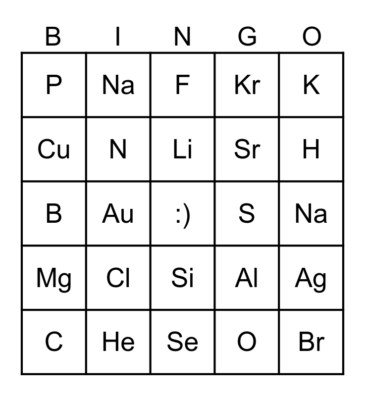 This bingo card has a free space and 34 words: Be, O, Ca, Ar, Mg, N, K, C, Na, F, Li, F, O, Ne, S, H, He, B, Cl, Al, Si, N, P, Na, Se, Br, Kr, Rb, Sr, Cu, Hg, Au, Ag and Ni.