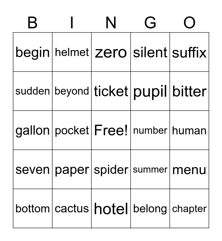 This bingo card has a free space and 24 words: paper, cactus, ticket, bottom, suffix, begin, sudden, helmet, number, spider, pupil, gallon, summer, menu, beyond, belong, human, zero, bitter, pocket, chapter, seven, silent and hotel.