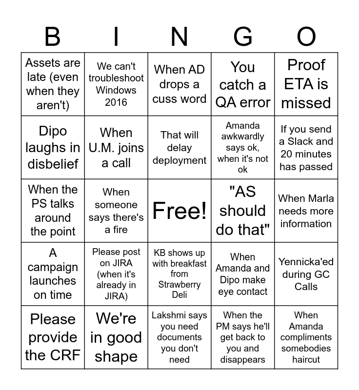 This bingo card has a free space and 24 words: Please post on JIRA (when it's already in JIRA), We're in good shape, That will delay deployment, Please provide the CRF, Proof ETA is missed, Assets are late (even when they aren't), Dipo laughs in disbelief, We can't troubleshoot Windows 2016, "AS should do that", KB shows up with breakfast from Strawberry Deli, Amanda awkwardly says ok, when it's not ok, When the PS talks around the point, When Amanda and Dipo make eye contact, Yennicka'ed during GC Calls, When U.M. joins a call, When the PM says he'll get back to you and disappears, When Marla needs more information, When AD drops a cuss word, If you send a Slack and 20 minutes has passed, When someone says there's a fire, When Amanda compliments somebodies haircut, A campaign launches on time, You catch a QA error and Lakshmi says you need documents you don't need.