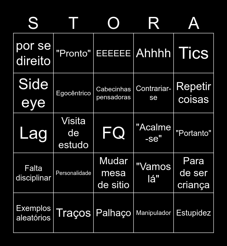 This bingo card has a free space and 24 words: Personalidade, Traços, Cabecinhas pensadoras, Exemplos aleatórios, Tics, por se direito, Side eye, "Pronto", "Acalme -se", Mudar mesa de sitio, Contrariar-se, Lag, "Vamos lá", Para de ser criança, Egocêntrico, Manipulador, "Portanto", EEEEEE, Repetir coisas, Visita de estudo, Estupidez, Falta disciplinar, Ahhhh and Palhaço.