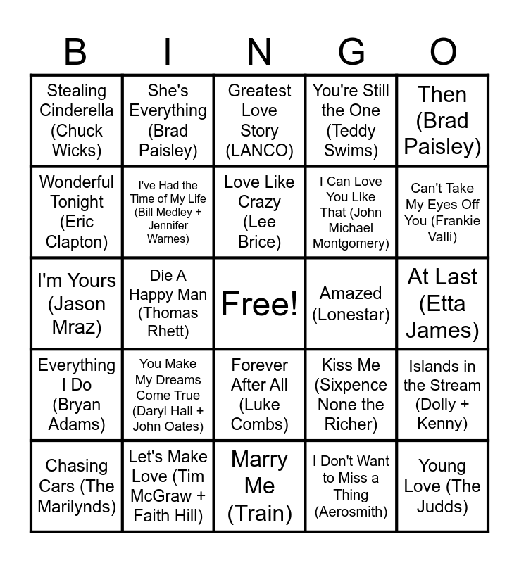 This bingo card has a free space and 60 words: Holding out for a Hero (Bonnie Tyler), Let's Make Love (Tim McGraw + Faith Hill), But I Do Love You (LeAnn Rimes), Everything I Do (Bryan Adams), I Don't Want to Miss a Thing (Aerosmith), L-O-V-E (Nat "King" Cole), I've Had the Time of My Life (Bill Medley + Jennifer Warnes), This Will Be an Everlasting Love (Natalie Cole), I Can Love You Like That (John Michael Montgomery), Next Thing You Know (Jordan Davis), You're Still the One (Teddy Swims), I Get to Love You (Ruelle), Wonderful Tonight (Eric Clapton), From This Moment On (Shania Twain), You and Me (Lifehouse), Stealing Cinderella (Chuck Wicks), Young Love (The Judds), Then (Brad Paisley), I Love You This Big (Scotty McCreary), Love Like Crazy (Lee Brice), Amazed (Lonestar), Greatest Love Story (LANCO), Chasing Cars (The Marilynds), Islands in the Stream (Dolly + Kenny), I Run to You (Lady A), God Gave Me You (Blake Shelton), Bless the Broken Road (Rascal Flatts), From the Ground Up (Dan + Shay), Can't Take My Eyes Off You (Frankie Valli), Thinking Out Loud (Ed Sheeran), Dilemma (Nelly), Chapel of Love (The Ronettes), Remember When (Alan Jackson), Livin' On Love (Alan Jackson), She's Everything (Brad Paisley), My Best Friend (Tim McGraw), Thank God (Kane + Katelyn Brown), Die A Happy Man (Thomas Rhett), Can't Help Falling In Love (Elvis), I'm Yours (Jason Mraz), A Thousand Years (Christina Perri), You Make My Dreams Come True (Daryl Hall + John Oates), At Last (Etta James), Forever and Ever, Amen (Randy Travis), Kiss Me (Sixpence None the Richer), What Makes You Beautiful (One Direction), You're the One That I Want (John Travolta + Olivia Newton-John), Could I Have This Dance (Anne Murray), Love Story (Taylor Swift), Forever After All (Luke Combs), Marry Me (Train), Just the Way You Are (Bruno Mars), All of Me (John Legend), Perfect (Ed Sheeran), I Can't Help Myself *Sugar Pie, Honey Bunch* (Four Tops), Ring of Fire (Johnny Cash), I Will Always Love You (Dolly Parton), A Thousand Miles (Vanessa Carlton), Love Shack (The B-52's) and I Wanna Dance with Somebody (Whitney Houston).