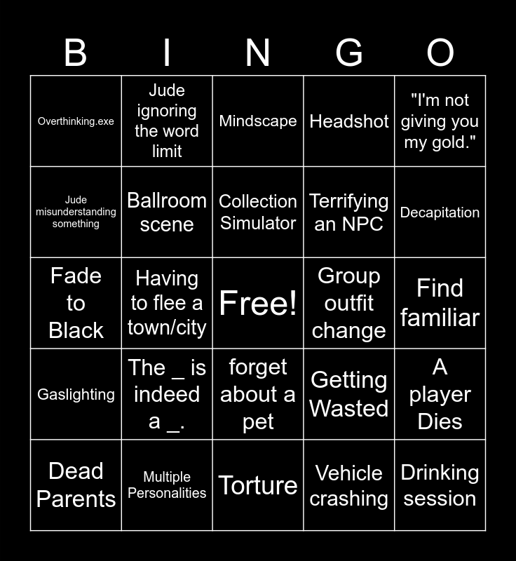 This bingo card has a free space and 24 words: The _ is indeed a _., Multiple Personalities, Collection Simulator, Dead Parents, "I'm not giving you my gold.", Overthinking.exe, Jude misunderstanding something, Jude ignoring the word limit, Group outfit change, forget about a pet, Terrifying an NPC, Fade to Black, Getting Wasted, A player Dies, Ballroom scene, Vehicle crashing, Find familiar, Mindscape, Decapitation, Having to flee a town/city, Drinking session, Gaslighting, Headshot and Torture.