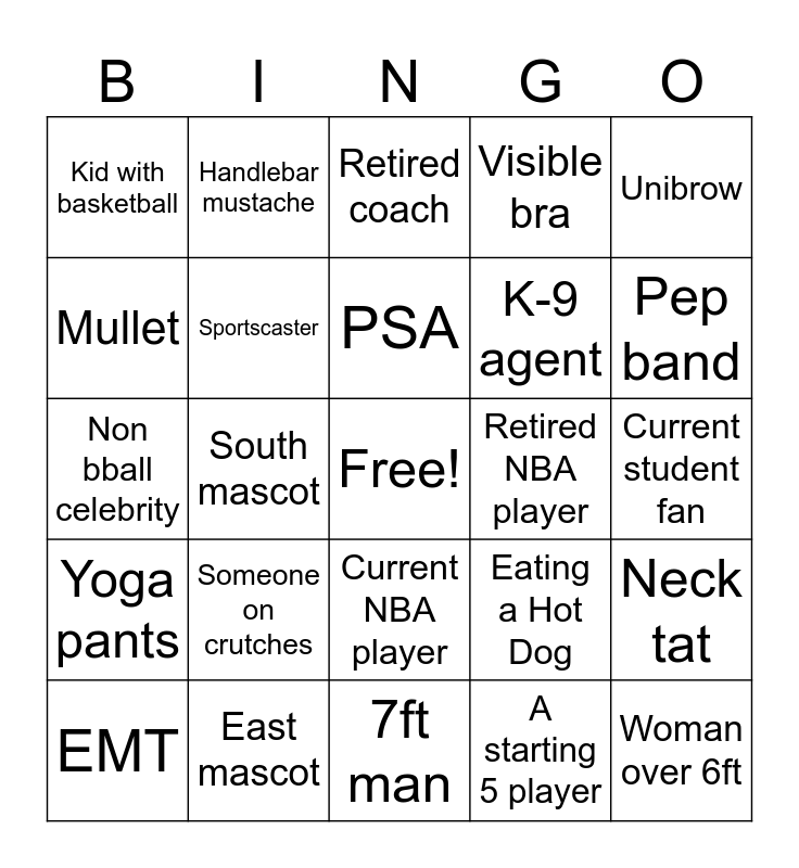 This bingo card has a free space and 30 words: East mascot, West mascot, South mascot, North mascot, Kid with basketball, Retired coach, Sportscaster, Current NBA player, Retired NBA player, 7ft man, Current student fan, Woman over 6ft, A starting 5 player, Dicky V, Pep band, Pony tail, Eating a Hot Dog, Yoga pants, Someone on crutches, Unibrow, Non bball celebrity, Big headphones, Handlebar mustache, K-9 agent, Mullet, Visible bra, Neck tat, EMT, PSA and Downing a beer.