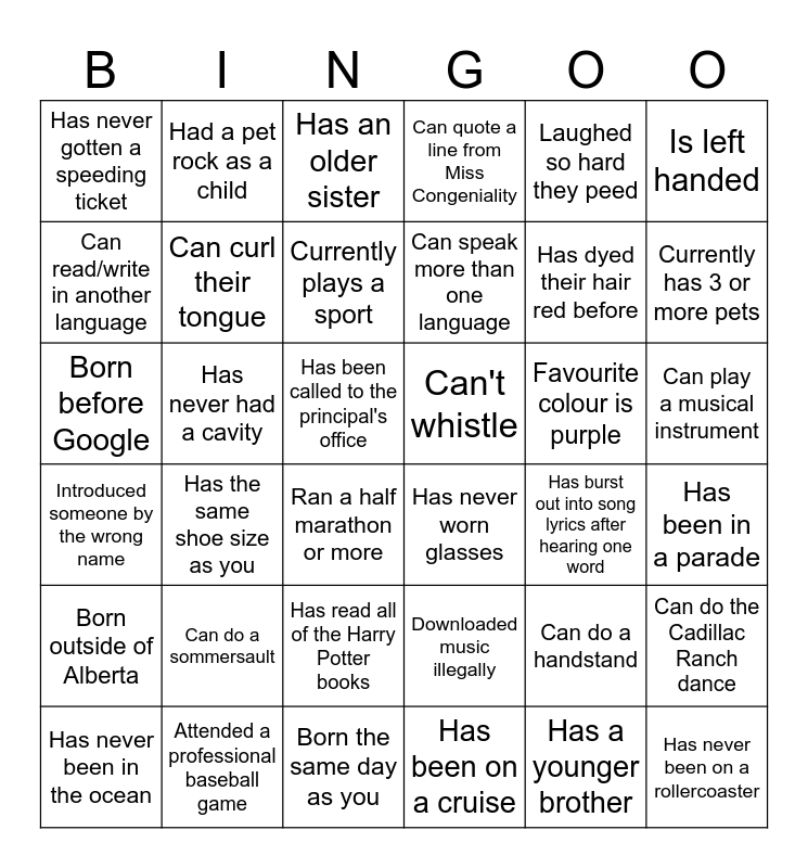 This bingo card has 42 words: Has a younger brother, Can curl their tongue, Wearing mismatched sock, Favourite colour is purple, Has been in a parade, Has the same shoe size as you, Born before Google, Wearing the same colour top as you, Has an older sister, Can play a musical instrument, Has been called to the principal's office, Can speak more than one language, Currently has 3 or more pets, Laughed so hard they peed, Attended a professional baseball game, Introduced someone by the wrong name, Can do the Cadillac Ranch dance, Has dyed their hair red before, Has never been on a rollercoaster, Had a pet rock as a child, Is left handed, Has read all of the Harry Potter books, Born outside of Alberta, Has never gotten a speeding ticket, Dislikes chocolate, Has never been in the ocean, Currently plays a sport, Has a pet that's not a dog or cat, Can do a sommersault, Can do a handstand, Can do a cartwheel, Can't whistle, Can read/write in another language, Has burst out into song lyrics after hearing one word, Born the same day as you, Ran a half marathon or more, Has never worn glasses, Has never had a cavity, Downloaded music illegally, Has been on a cruise, Can quote a line from Miss Congeniality and Played "The Oregon Trail".