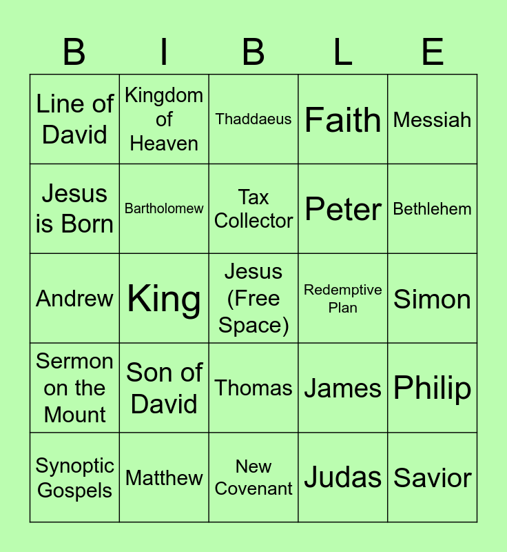This bingo card has a free space and 24 words: Son of David, Matthew, Tax Collector, Synoptic Gospels, Messiah, Line of David, Jesus is Born, Kingdom of Heaven, Redemptive Plan, Thomas, Peter, Andrew, James, Philip, Bartholomew, Judas, Simon, Thaddaeus, Bethlehem, King, Savior, Sermon on the Mount, Faith and New Covenant.