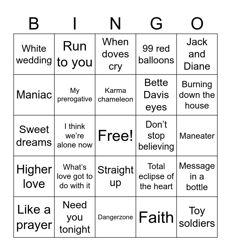 This bingo card has a free space and 34 words: Heaven is a place on earth, Faith, Everybody wants to rule the world, Living on a prayer, Higher love, My prerogative, Jack and Diane, Like a prayer, Run to you, Fight for your right, Karma chameleon, When doves cry, Love is a battlefield, Dancing in the dark, Don’t stop believing, Burning down the house, Need you tonight, Sweet dreams, What’s love got to do with it, Total eclipse of the heart, Straight up, Stand, White wedding, Maneater, Dangerzone, Toy soldiers, 99 red balloons, Never give you up, Bette Davis eyes, Maniac, With or without you, I think we’re alone now, Message in a bottle and Beds are burning.