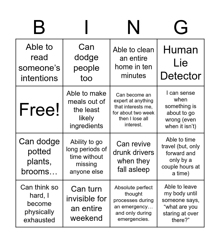 This bingo card has 16 words: Can turn invisible for an entire weekend, Able to time travel (but, only forward and only by a couple hours at a time), Able to clean an entire home in ten minutes, Able to read someone’s intentions, Can dodge potted plants, brooms…, Can dodge people too, Can revive drunk drivers when they fall asleep, Absolute perfect thought processes during an emergency… and only during emergencies., Free!, Able to make meals out of the least likely ingredients, Can think so hard, I become physically exhausted, Human Lie Detector, Ability to go long periods of time without missing anyone else, I can sense when something is about to go wrong (even when it isn’t), Can become an expert at anything that interests me, for about two week then I lose all interest. and Able to leave my body until someone says, “what are you staring at over there?”.