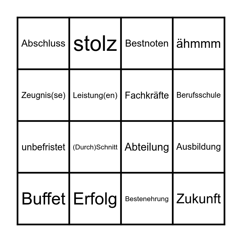 This bingo card has 16 words: Erfolg, Ausbildung, Bestnoten, Abschluss, unbefristet, stolz, Abteilung, Bestenehrung, Zeugnis(se), Leistung(en), Buffet, ähmmm, (Durch)Schnitt, Berufsschule, Fachkräfte and Zukunft.