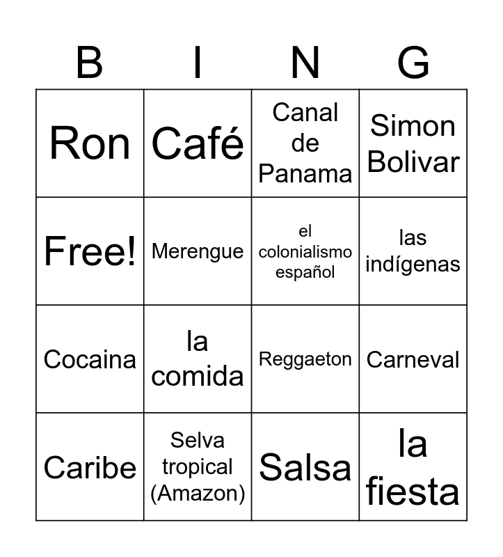 This bingo card has 16 words: Selva tropical (Amazon), Carneval, Canal de Panama, Ron, Cocaina, Café, Reggaeton, Salsa, Free!, Merengue, Caribe, Simon Bolivar, la comida, las indígenas, el colonialismo español and la fiesta.