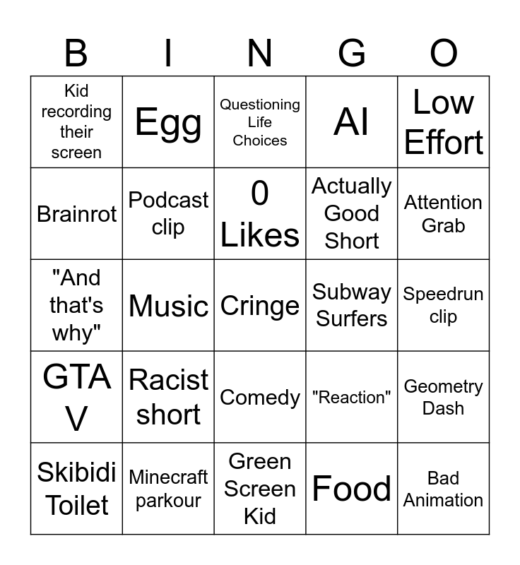 This bingo card has a free space and 24 words: Racist short, Minecraft parkour, 0 Likes, Skibidi Toilet, Low Effort, Kid recording their screen, Brainrot, Egg, Subway Surfers, Comedy, Actually Good Short, "And that's why", "Reaction", Geometry Dash, Podcast clip, Food, Speedrun clip, Questioning Life Choices, Attention Grab, Music, Bad Animation, GTA V, AI and Green Screen Kid.
