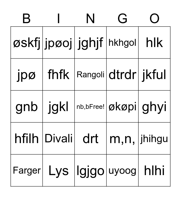 This bingo card has a free space and 24 words: Divali, Lys, Rangoli, Farger, hlk, øskfj, jpø, jpøoj, økøpi, drt, dtrdr, gnb, m,n,, jhihgu, fhfk, uyoog, ghyi, jghjf, jkful, jgkl, hlhi, hfilh, hkhgol and lgjgo.