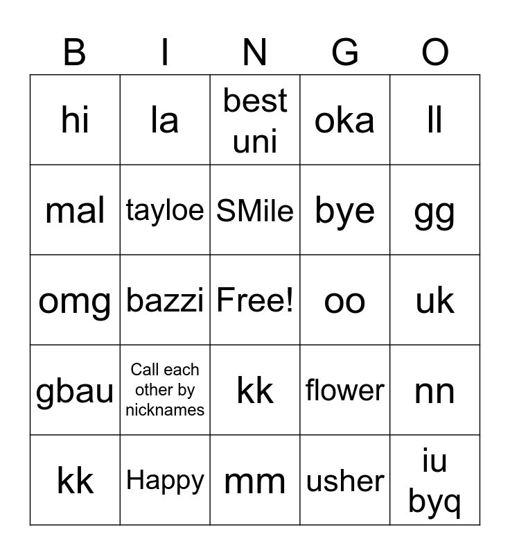 This bingo card has a free space and 24 words: Call each other by nicknames, Happy, SMile, kk, ll, hi, mal, la, oo, kk, bye, omg, flower, nn, tayloe, usher, uk, best uni, gg, bazzi, iu byq, gbau, oka and mm.