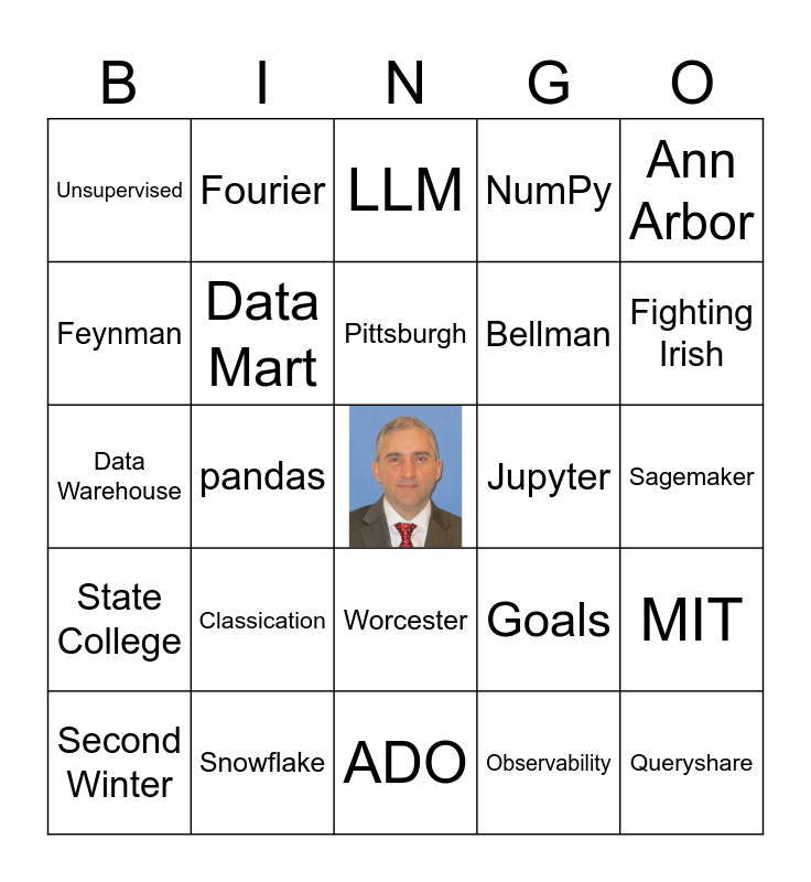 This bingo card has a free space and 40 words: Data Lake, Data Warehouse, Classification, Data Mart, Snowflake, Worcester, Pittsburgh, Rambling Wreck, Ann Arbor, State College, pandas, NumPy, Queryshare, Sagemaker, Jupyter, Classication, Isolation Forests, Unsupervised, GAN, LLM, MIT, Observability, Bellman, Feynman, Kalman, Bohr, Leibniz, Newton, Nyquist, Bode, Fool's Spring, Second Winter, Workday Learning, Goals, Fighting Irish, ADO, Maxwell, Laplace, Fourier and PBR.