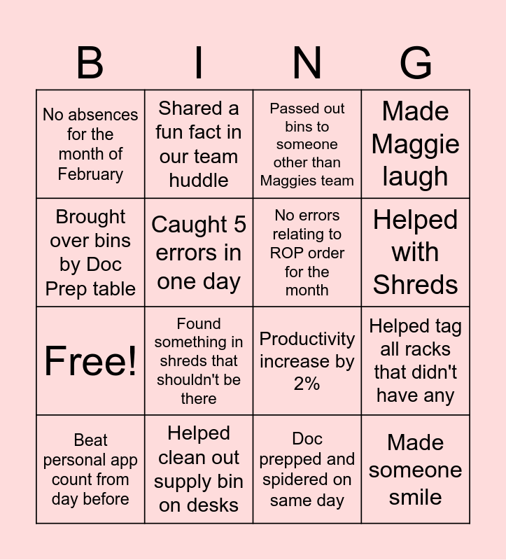 This bingo card has 25 words: Worked in a different function other than your primary, Brought over bins from the back, Productivity increase by 2%, Moved all racks to the floor from a different color, No absences for the month of February, Shared a fun fact in our team huddle, Passed out bins to someone other than Maggies team, Made Maggie laugh, Free!, Found something in shreds that shouldn't be there, Doc prepped and spidered on same day, Helped tag all racks that didn't have any, Helped someone make an envelope copy, Helped clean out supply bin on desks, No errors relating to ROP order for the month, Answered a Doc prep question, Beat personal app count from day before, Caught 5 errors in one day, Over 100% productivty, Made someone smile, Brought over bins by Doc Prep table, Escalated a check not over stamped, Went to the CRU, Helped with Shreds and Caught a potential PII.