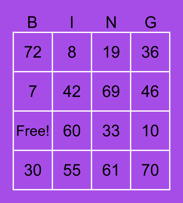 This bingo card has 25 words: 1, 20, 33, 49, 72, 8, 19, 36, Free!, 60, 61, 10, 27, 55, 69, 12, 30, 42, 51, 70, 7, 18, 40, 46 and 75.