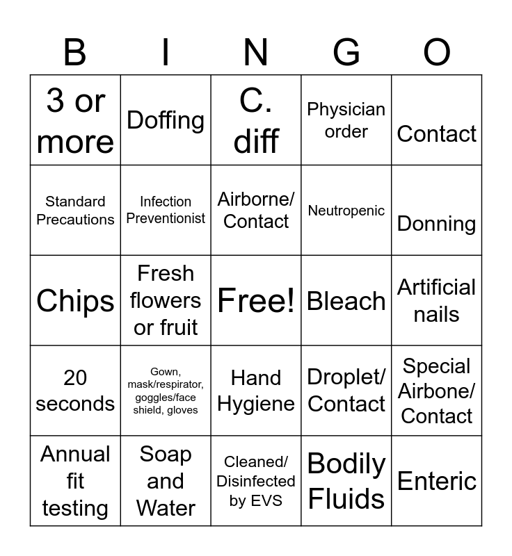 This bingo card has a free space and 24 words: Gown, mask/respirator, goggles/face shield, gloves, Soap and Water, Airborne/ Contact, Annual fit testing, Contact, 3 or more, Standard Precautions, Doffing, Bleach, Hand Hygiene, Neutropenic, Chips, Droplet/ Contact, Special Airbone/ Contact, Infection Preventionist, Bodily Fluids, Artificial nails, C. diff, Donning, Fresh flowers or fruit, Enteric, 20 seconds, Physician order and Cleaned/ Disinfected by EVS.