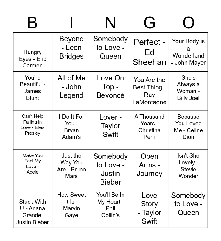 This bingo card has a free space and 34 words: I will Always Love You - Whitney Houston, Love Story - Taylor Swift, 10,000 Hours - Dan + Shay, Justin Bieber, Your Song - Elton John, Make You Feel My Love - Adele, All of Me - John Legend, Your Body is a Wonderland - John Mayer, Stuck With U - Ariana Grande, Justin Bieber, Beyond - Leon Bridges, Time After time - Cyndi Lauper, Love On Top - Beyoncé, Somebody to Love - Queen, My Girl - The Temptations, At Last - Etta James, A Thousand Years - Christina Perri, She’s Always a Woman - Billy Joel, How Sweet It Is - Marvin Gaye, Can’t Help Falling in Love - Elvis Presley, Just the Way You Are - Bruno Mars, Open Arms - Journey, Somebody to Love - Justin Bieber, She Will Be Loved - Maroon 5, Hungry Eyes - Eric Carmen, Because You Loved Me - Celine Dion, You’ll Be In My Heart - Phil Collin’s, Somebody to Love - Queen, Perfect - Ed Sheehan, Love on the Brain - Rihanna, You Are the Best Thing - Ray LaMontagne, You’re Beautiful - James Blunt, With Or Without You - U2, I Do It For You - Bryan Adam’s, Isn’t She Lovely - Stevie Wonder and L-O-V-E - Nat King Cole.