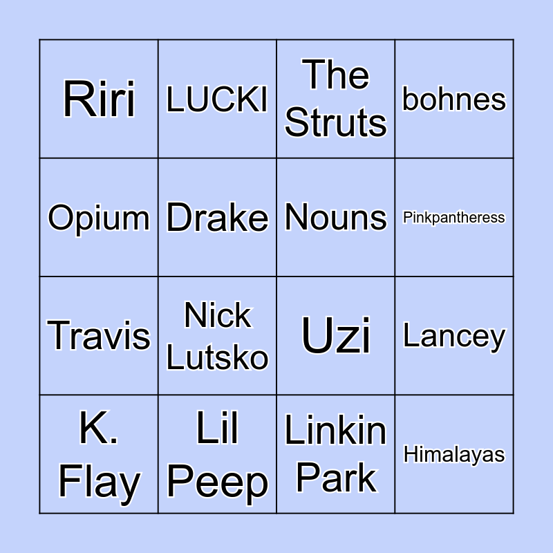 This bingo card has 26 words: Future, Ye, Pinkpantheress, Britney, Opium, Riri, Drake, LUCKI, Linkin Park, Lana, Travis, Uzi, SZA, Aaliyah, Lancey, The Weeknd, bohnes, Himalayas, The Struts, K. Flay, Nick Lutsko, Unlike Pluto, Lil Peep, Oliver Tree, Nouns and HeavenKnows.
