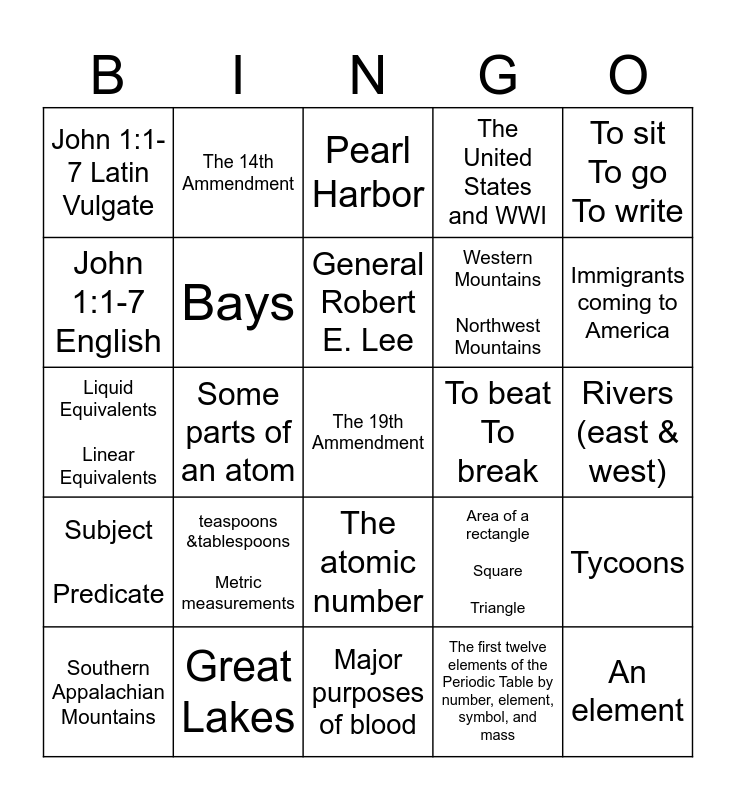 This bingo card has 25 words: teaspoons &tablespoons Metric measurements, Major purposes of blood, General Robert E. Lee, Southern Appalachian Mountains, To sit To go To write, John 1:1-7 Latin Vulgate, John 1:1-7 English, The 14th Ammendment, To beat To break, The atomic number, Western Mountains Northwest Mountains, Liquid Equivalents Linear Equivalents, Area of a rectangle Square Triangle, Tycoons, Bays, An element, Rivers (east & west), Pearl Harbor, Immigrants coming to America, Some parts of an atom, The 19th Ammendment, Great Lakes, Subject Predicate, The United States and WWI and The first twelve elements of the Periodic Table by number, element, symbol, and mass.