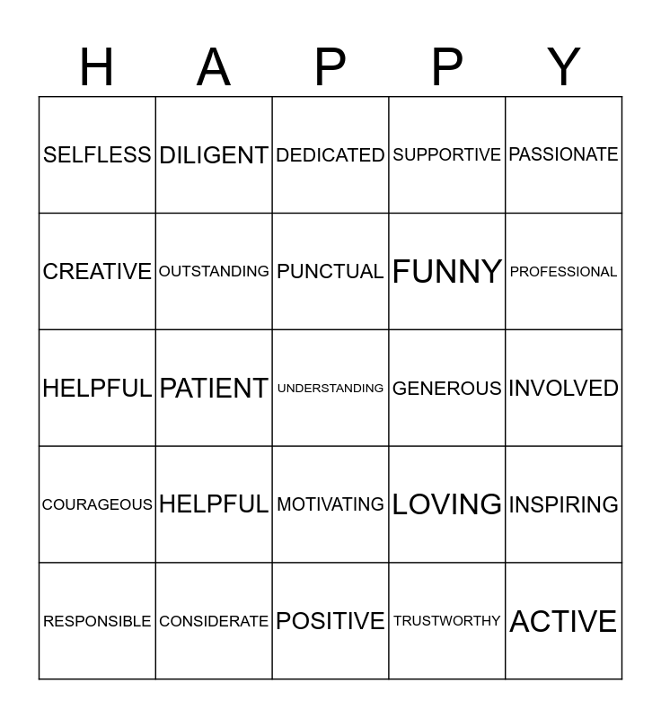 This bingo card has 25 words: HELPFUL, POSITIVE, PUNCTUAL, RESPONSIBLE, PASSIONATE, SELFLESS, CREATIVE, DILIGENT, GENEROUS, MOTIVATING, FUNNY, HELPFUL, LOVING, INSPIRING, OUTSTANDING, ACTIVE, INVOLVED, DEDICATED, PROFESSIONAL, PATIENT, UNDERSTANDING, CONSIDERATE, COURAGEOUS, SUPPORTIVE and TRUSTWORTHY.