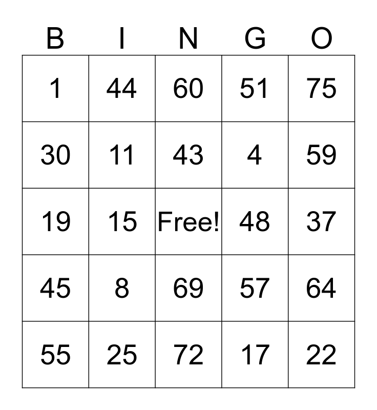 This bingo card has a free space and 24 words: 8, 25, 43, 55, 75, 1, 30, 44, 48, 69, 4, 19, 57, 64, 11, 17, 37, 60, 59, 15, 22, 45, 51 and 72.