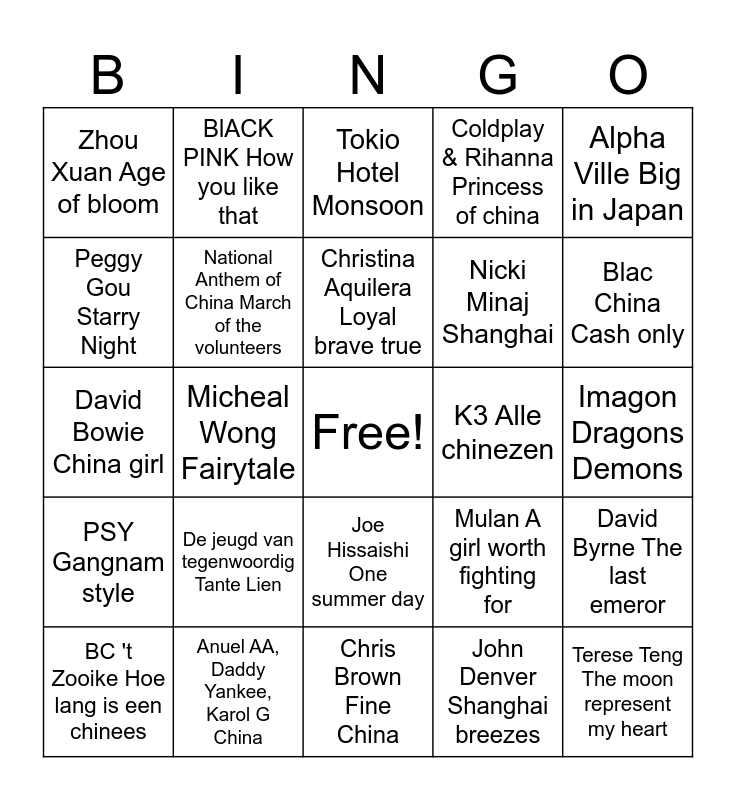 This bingo card has a free space and 28 words: David Byrne The last emeror, Billy Joel Boodnight Saigon, Nicki Minaj Shanghai, John Denver Shanghai breezes, Peggy Gou Starry Night, Tokio Hotel Monsoon, BlACK PINK How you like that, PSY Gangnam style, K3 Alle chinezen, BC 't Zooike Hoe lang is een chinees, David Bowie China girl, Coldplay & Rihanna Princess of china, Anuel AA, Daddy Yankee, Karol G China, Chris Brown Fine China, Blac China Cash only, Wieteke van Dort Geef mij maar nasi goreng, De jeugd van tegenwoordig Tante Lien, National Anthem of China March of the volunteers, Christina Aquilera Loyal brave true, Joe Hissaishi One summer day, Zhou Xuan Age of bloom, Carln Douglas Kong fu fightning, Terese Teng The moon represent my heart, Micheal Wong Fairytale, Imagon Dragons Demons, Mulan A girl worth fighting for, Alpha Ville Big in Japan and Katie Melua Nine Million bicycles.