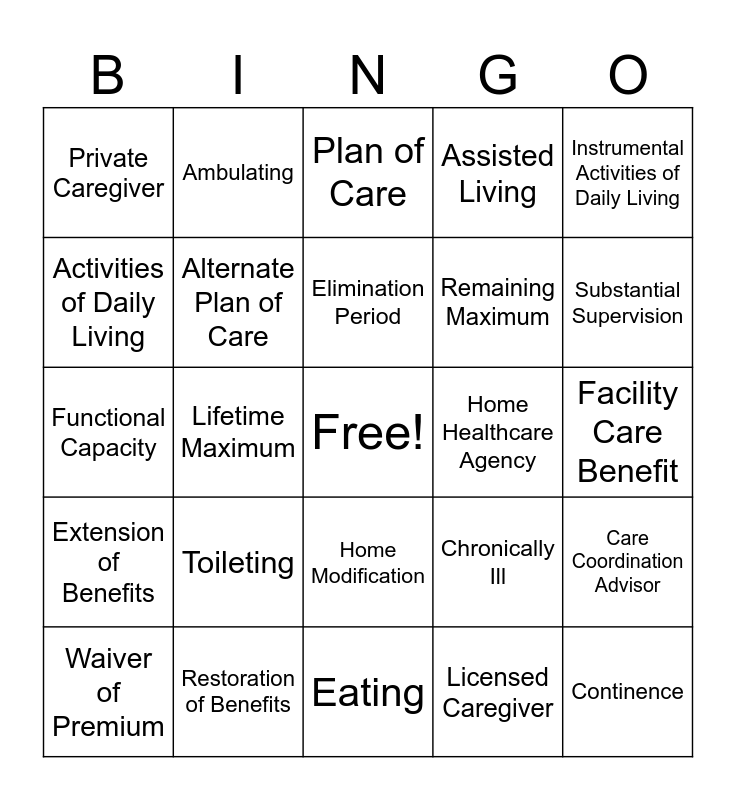 This bingo card has a free space and 51 words: Bathing, Continence, Dressing, Eating, Toileting, Transferring, Ambulating, Level of Care, Activities of Daily Living, Adult Day Care, Alternate Plan of Care, Assisted Living, Care Coordination Advisor, Chronically Ill, Cognitive Impairment, Disability, Elimination Period, Home Healthcare Agency, Hospice, Instrumental Activities of Daily Living, Lifetime Maximum, Licensed Caregiver, Private Caregiver, Remaining Maximum, Resource Advisor, Respite Care, Substantial Supervision, Unlicensed Caregiver, Waiver of Premium, Plan of Care, Licensed Health Care Practitioner, Skilled Nursing Facility, Home Health Care, EOB, Bed Reservation, Restoration of Benefits, Covered Services, Homemaker Services, Home First Benefit, Home and Community Care Benefit, Facility Care Benefit, Extension of Benefits, Ambulance Service Benefit, First-Time Cash Benefit, Informal Caregiver Training, International Coverage, Functional Capacity, Home Safety Check, Durable Medical Equipment, Home Modification and Medical Alert System.