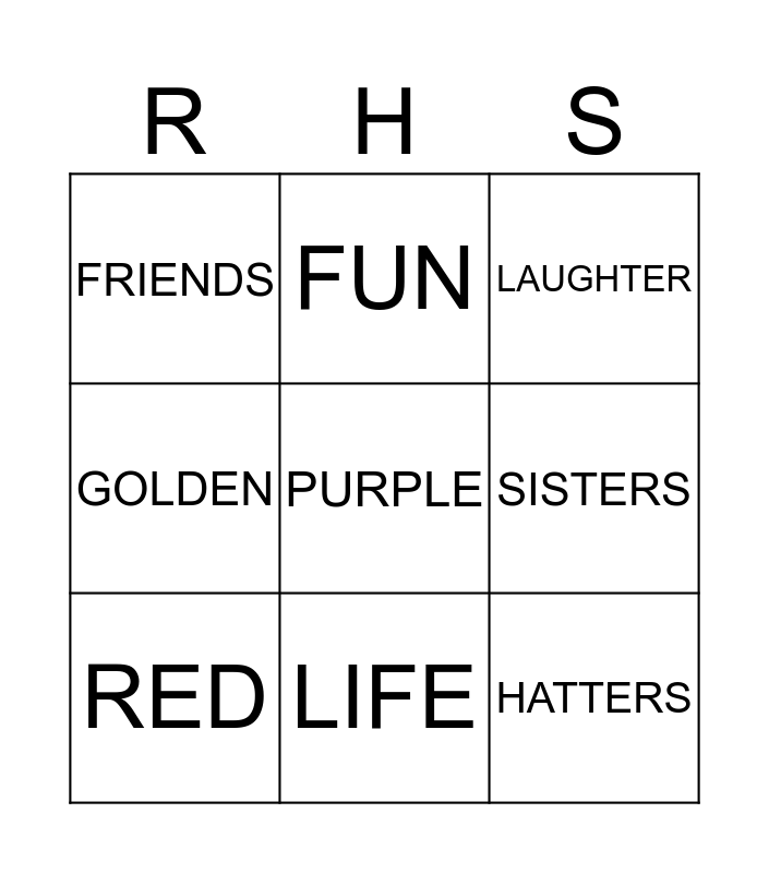 This bingo card has a free space and 8 words: SISTERS, LAUGHTER, FUN, RED, FRIENDS, HATTERS, GOLDEN and LIFE.