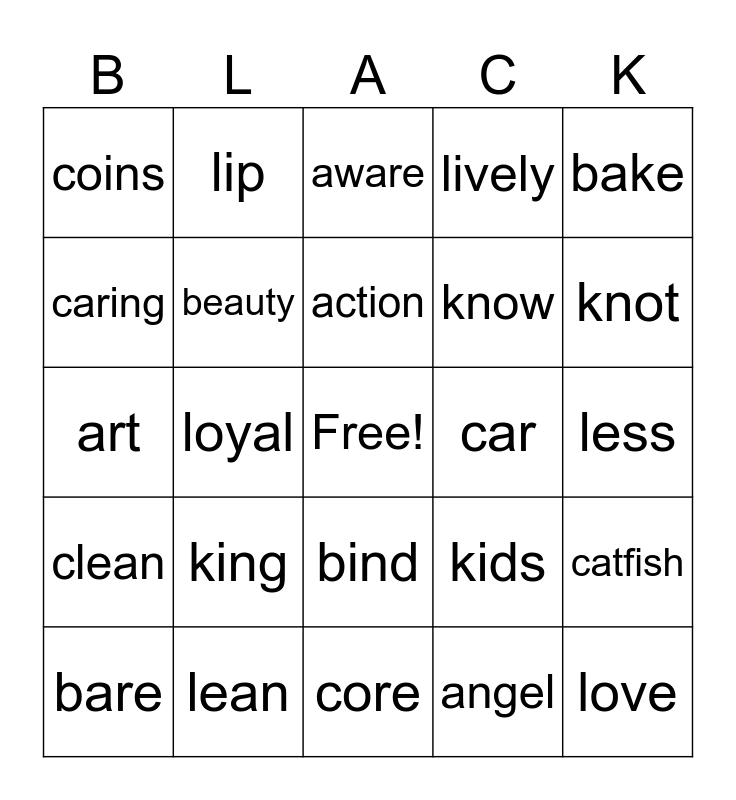 This bingo card has a free space and 49 words: bold, love, ageless, core, king, beware, lip, auntie, caring, kind, beauty, lively, catfish, kids, bounty, liver, action, car, kin, bake, loyal, angel, coins, know, knowledge, knot, bare, coily, bind, clean, comb, biscuit, beer, bass, lean, label, legit, language, less, cobbler, cast, cabbage, bacon, argue, art, aware, brag, brown and articulate.