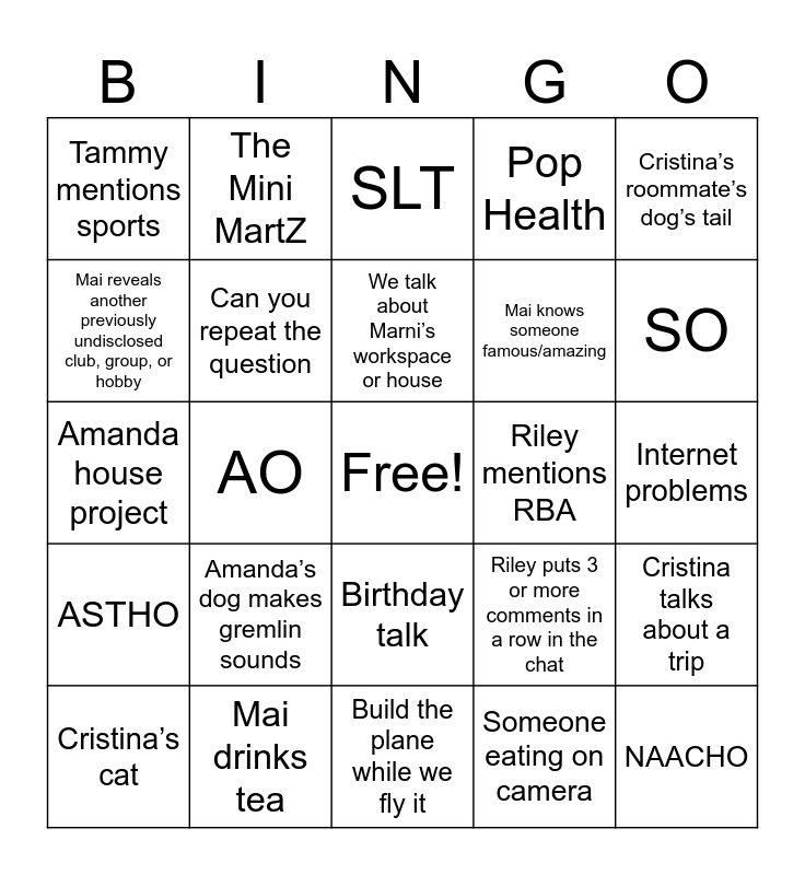 This bingo card has a free space and 24 words: Amanda’s dog makes gremlin sounds, Mai drinks tea, We talk about Marni’s workspace or house, Cristina’s cat, Cristina’s roommate’s dog’s tail, Tammy mentions sports, Mai reveals another previously undisclosed club, group, or hobby, The Mini MartZ, Riley mentions RBA, Birthday talk, Mai knows someone famous/amazing, Amanda house project, Riley puts 3 or more comments in a row in the chat, Cristina talks about a trip, Can you repeat the question, Someone eating on camera, Internet problems, SLT, SO, AO, NAACHO, ASTHO, Pop Health and Build the plane while we fly it.