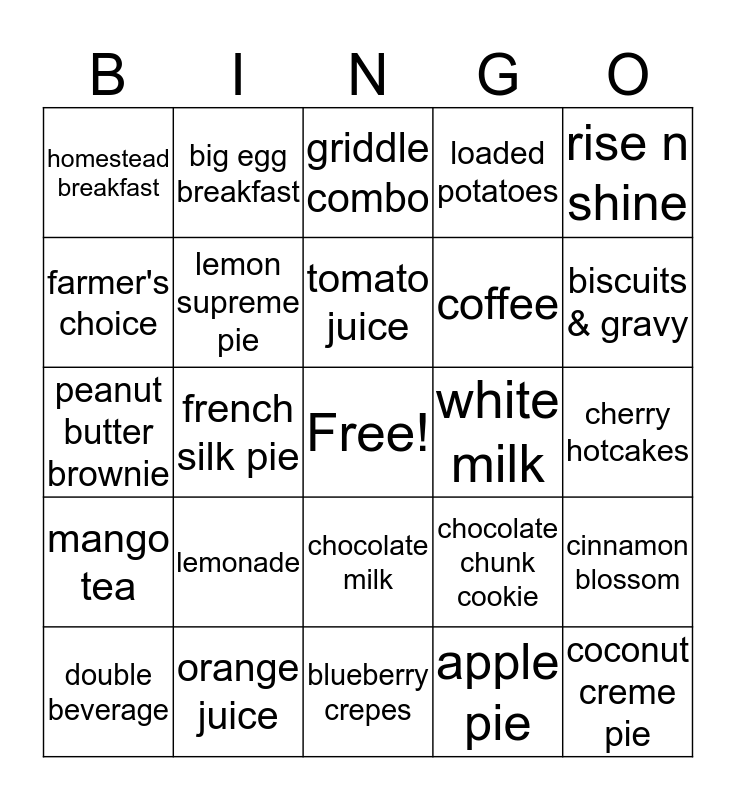 This bingo card has a free space and 24 words: lemonade, orange juice, tomato juice, double beverage, rise n shine, homestead breakfast, farmer's choice, big egg breakfast, white milk, chocolate milk, coffee, peanut butter brownie, chocolate chunk cookie, cinnamon blossom, lemon supreme pie, apple pie, cherry hotcakes, griddle combo, biscuits & gravy, french silk pie, coconut creme pie, mango tea, loaded potatoes and blueberry crepes.