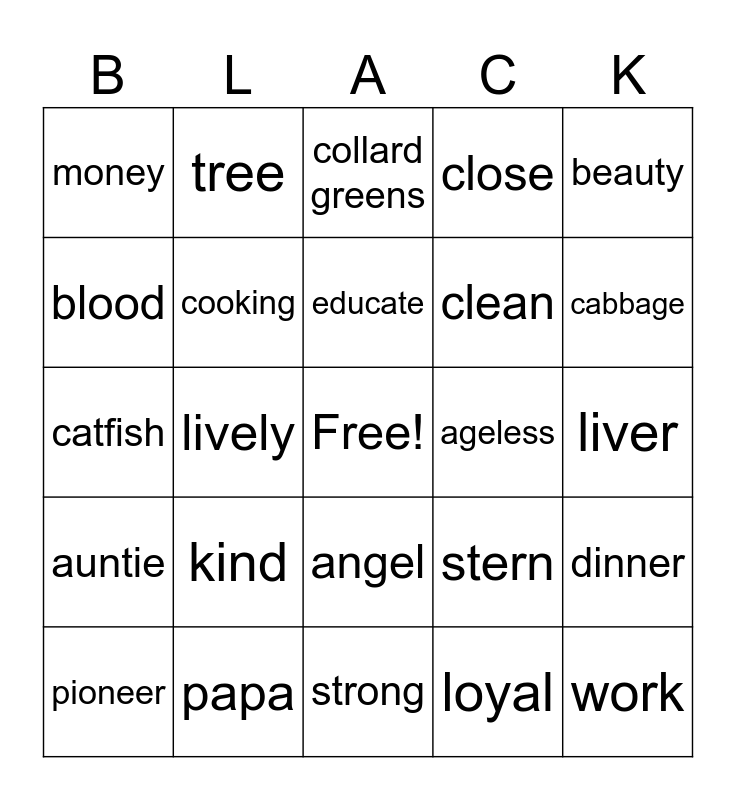 This bingo card has a free space and 49 words: church, work, love, strong, kind, family, tree, roots, blood, kin, cooking, close, dinner, stern, siblings, grace, educate, ageless, black, beauty, lively, loyal, money, clean, lean, cabbage, pioneer, bold, angel, auntie, bounty, mama, art, action, papa, madear, kids, coily, liver, core, brag, legit, articulate, cobbler, catfish, collard greens, laugh, GOD and fashion.