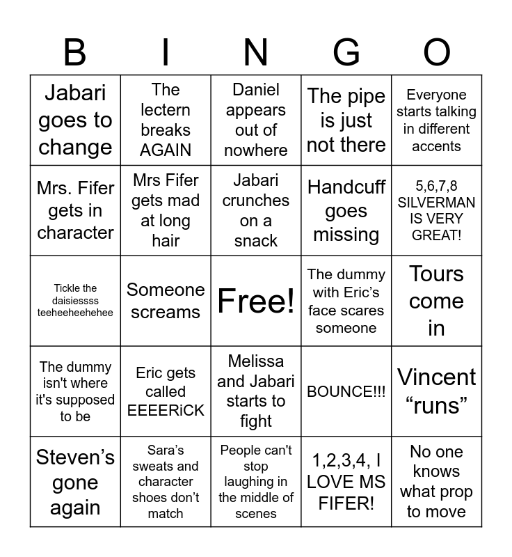 This bingo card has a free space and 24 words: Eric gets called EEEERiCK, Sara’s sweats and character shoes don’t match, Jabari crunches on a snack, Steven’s gone again, Everyone starts talking in different accents, Jabari goes to change, Mrs. Fifer gets in character, The lectern breaks AGAIN, The dummy with Eric’s face scares someone, Melissa and Jabari starts to fight, Handcuff goes missing, Tickle the daisiessss teeheeheehehee, BOUNCE!!!, Vincent “runs”, Mrs Fifer gets mad at long hair, 1,2,3,4, I LOVE MS FIFER!, Tours come in, Daniel appears out of nowhere, 5,6,7,8 SILVERMAN IS VERY GREAT!, Someone screams, No one knows what prop to move, The dummy isn't where it's supposed to be, The pipe is just not there and People can't stop laughing in the middle of scenes.