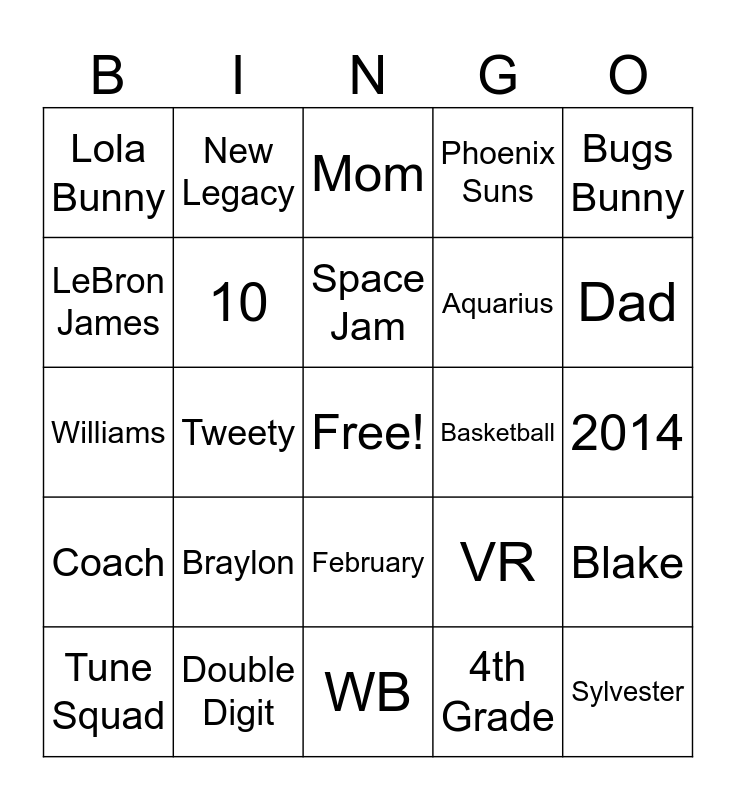This bingo card has a free space and 24 words: Braylon, Double Digit, Space Jam, Tune Squad, Bugs Bunny, Lola Bunny, LeBron James, New Legacy, Basketball, February, Aquarius, Williams, VR, Blake, 10, 4th Grade, 2014, Mom, Dad, Tweety, Sylvester, Coach, Phoenix Suns and WB.