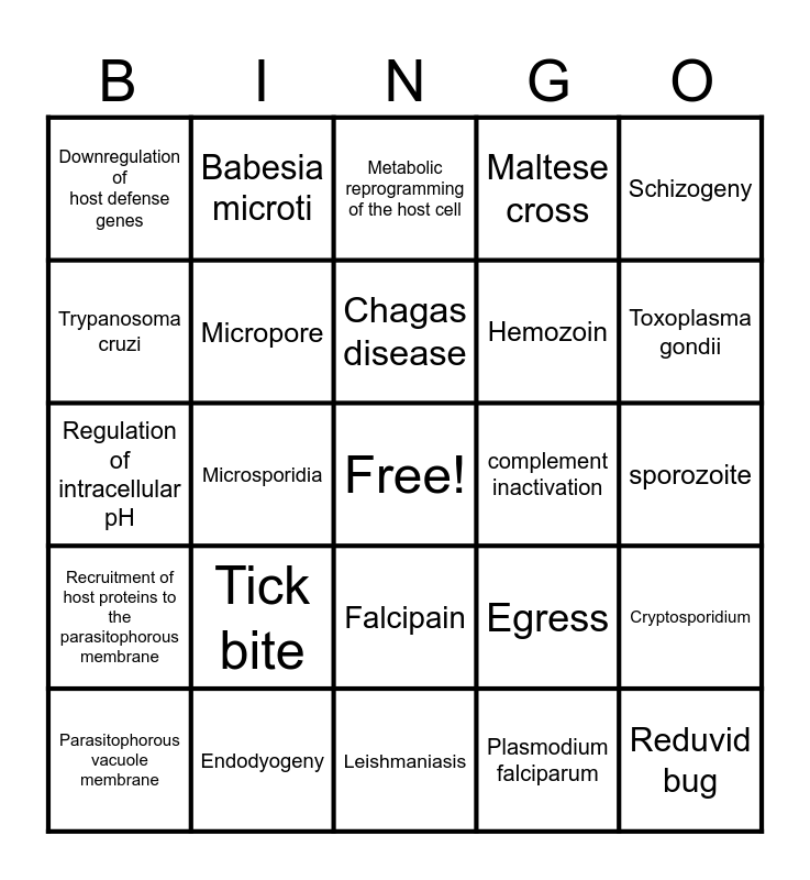 This bingo card has a free space and 34 words: apicomplexans, Plasmodium falciparum, shift in M2 to M1 response, 23, Recruitment of host proteins to the parasitophorous membrane, Micropore, Schizogeny, Parasitophorous vacuole membrane, Babesia microti, Dampening of PRR signalling, Chagas disease, Metabolic reprogramming of the host cell, 3, Block cell death signals, complement inactivation, Toxoplasma gondii, Endodyogeny, Regulation of intracellular pH, Tick bite, Egress, Falcipain, 80, Downregulation of host defense genes, sporozoite, Leishmaniasis, Reduvid bug, Maltese cross, Gliding motility, Hemozoin, Trypanosoma cruzi, Obligate, Microsporidia, Cryptosporidium and Erythrocyte.