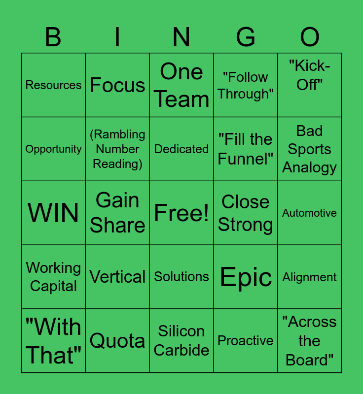 This bingo card has a free space and 24 words: "With That", Vertical, Dedicated, Proactive, "Kick-Off", Resources, Focus, One Team, Close Strong, Automotive, WIN, (Rambling Number Reading), Epic, Alignment, Opportunity, Quota, Silicon Carbide, "Follow Through", Bad Sports Analogy, Working Capital, Gain Share, Solutions, "Fill the Funnel" and "Across the Board".