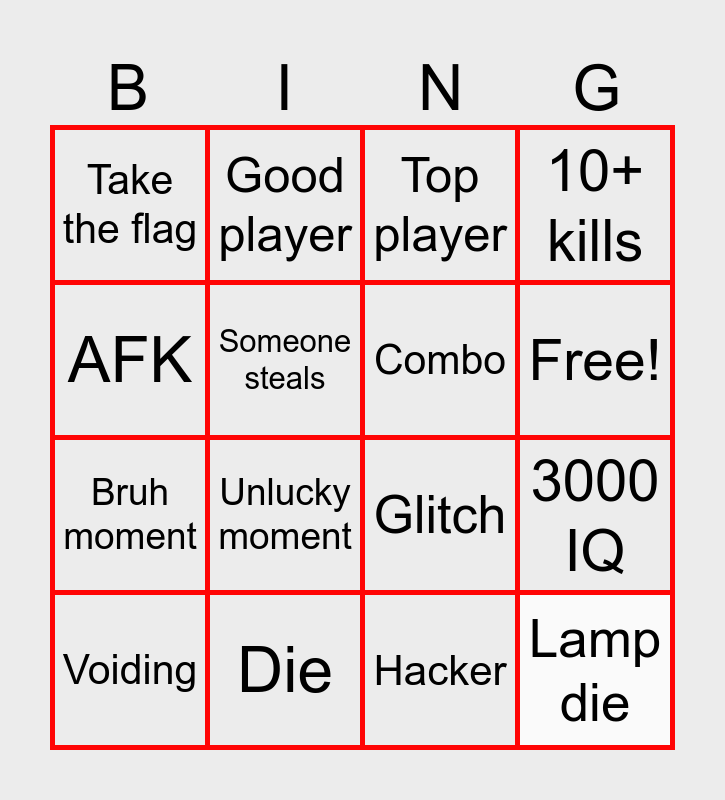 This bingo card has 17 words: Hacker, Voiding, Top player, Take the flag, Unlucky moment, 10+ kills, 3000 IQ, Combo, Free!, Someone steals, Die, Glitch, AFK, Good player, Bruh moment, Epic moment and Lamp die.