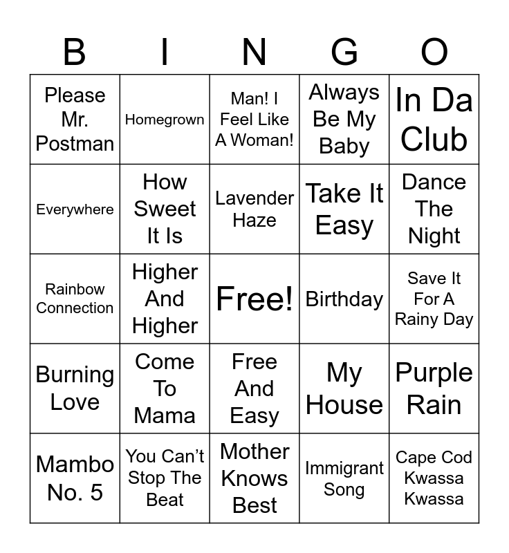 This bingo card has a free space and 100 words: Rewind, As Good As I Once Was, Save It For A Rainy Day, Take A Chance On Me, Chiquitita, Save A Horse (Ride A Cowboy), Casey Jones, Burnin’ For You, Back In Black, Baba O’Riley, Beast Of Burden, Dream On, The Wizard And I, You Can’t Stop The Beat, Stayin’ Alive, Let’s Groove, Take It Easy, Listen To The Music, Livin’ Thing, Bennie And The Jets, Sister Golden Hair, Lean On Me, Brick House, You’re My Best Friend, You Make My Dreams Come True, Birthday, In Da Club, My House, Sweet Child O’ Mine, Brown Eyed Girl, Higher And Higher, Please Mr. Postman, Wagon Wheel, We Are Family, Immigrant Song, Lavender Haze, Purple Rain, Ain’t No Mountain High Enough, Stuck In The Middle With You, I’ll Be Around, Signed, Sealed, Delivered, Pure Imagination, Rainbow Connection, Hold On, Dance The Night, Man! I Feel Like A Woman!, Dancing Queen, Run The World, No One, Mother Knows Best, God, Your Mama, And Me, Suddenly, Seymour, Waffle House, Celebration, Funkytown, YMCA, Uptown Girl, Girls Just Want To Have Fun, I Love Rock ‘N Roll, Always Be My Baby, I Wanna Dance With Somebody, Mama Said, Mama Said Knock You Out, Just The Two Of Us, Dear Mama, The Best Day, Isn’t She Lovely, 9 To 5, I’m Alright, Where You Lead, Heffalumps And Woozles, Come To Mama, Sway, The Schuyler Sisters, Beauty And The Beast, Don’t Rain On My Parade, I Could Have Danced All Night, Everywhere, Over The Rainbow, Baby, I’m Yours, Crazy, Cape Cod Kwassa Kwassa, Hooked On A Feeling, Free And Easy, Cop Car, Homegrown, I Don’t Want This Night To End, Burnin’ Up, Burning Down The House, Burning Love, Sugar Magnolia, For What It’s Worth, Girl On Fire, Mambo No. 5, How Sweet It Is, Friends In Low Places, In My Life, Purple Haze, Sir Duke and I’m Shipping Up To Boston.