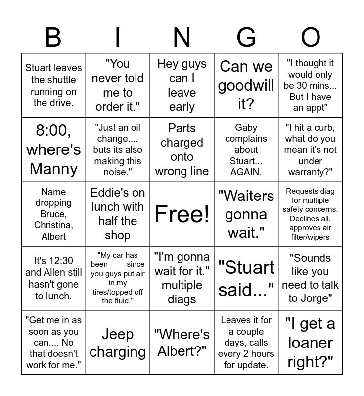 This bingo card has a free space and 29 words: "Get me in as soon as you can.... No that doesn't work for me.", "My car is new, it shouldn't have these issues." 4+ years, 50k+ miles, Eddie's on lunch with half the shop, 8:00am "My salesperson told me to come in", Stuart leaves the shuttle running on the drive., Hey guys can I leave early, "Just an oil change.... buts its also making this noise.", "My car has been____ since you guys put air in my tires/topped off the fluid.", "Waiters gonna wait.", Jeep charging, Requests diag for multiple safety concerns. Declines all, approves air filter/wipers, "I get a loaner right?", "Where's Albert?", Leaves it for a couple days, calls every 2 hours for update., "I hit a curb, what do you mean it's not under warranty?", "I talked to Manny..." comes in on his day off, "I'm gonna wait for it." multiple diags, It's 12:30 and Allen still hasn't gone to lunch., "I thought it would only be 30 mins... But I have an appt", Name dropping Bruce, Christina, Albert, "Stuart said...", Where's Alberts gas card, Gaby complains about Stuart... AGAIN., 8:00, where's Manny, Can we goodwill it?, "You never told me to order it.", "Sounds like you need to talk to Jorge", Parts charged onto wrong line and "Albert call Christina please.".