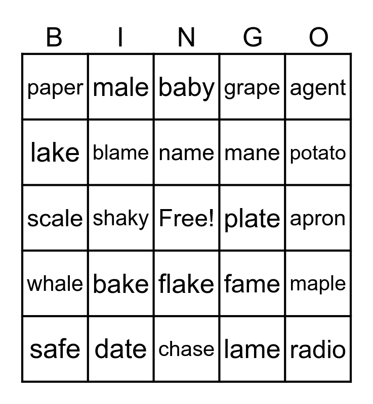 This bingo card has a free space and 24 words: bake, date, name, safe, agent, paper, lake, male, plate, flake, mane, scale, fame, maple, blame, lame, apron, baby, potato, shaky, radio, whale, grape and chase.