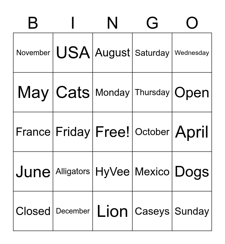 This bingo card has a free space and 38 words: Trains, Planes, Automobiles, Cats, Dogs, Alligators, Monday, Tuesday, Wednesday, Thursday, Friday, Saturday, Sunday, April, May, June, July, August, September, October, November, December, Open, Closed, Tiger, Lion, February, March, January, Target, Walmart, HyVee, Caseys, USA, Canada, Mexico, France and England.