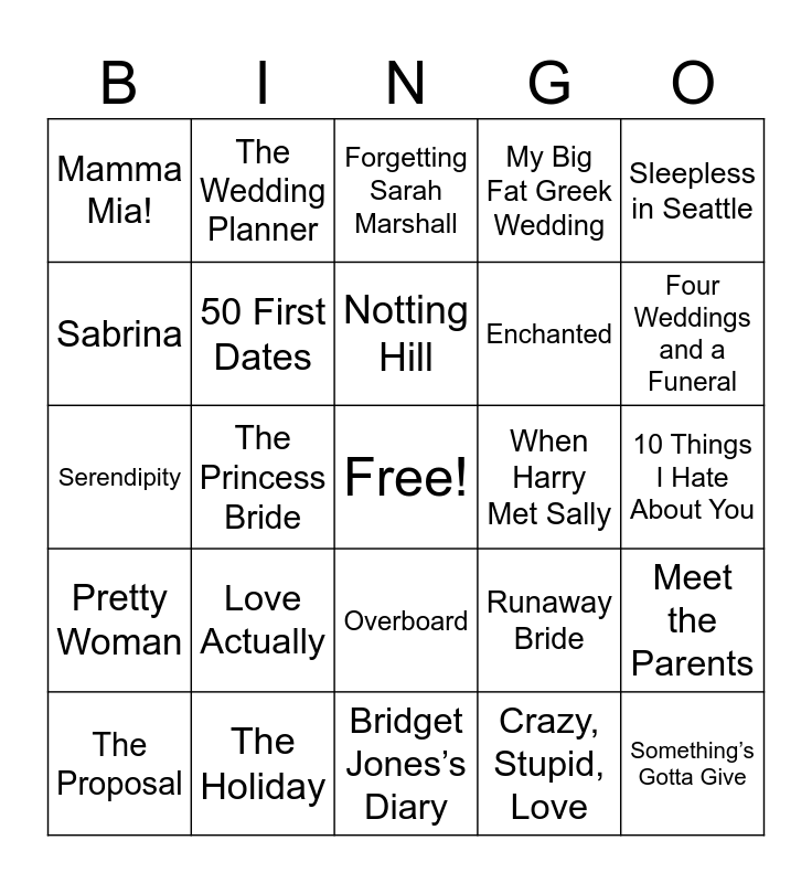 This bingo card has a free space and 44 words: Crazy Rich Asians, Something’s Gotta Give, The Wedding Singer, The Proposal, Days of Summer, Crazy, Stupid, Love, Forgetting Sarah Marshall, Reality Bites, Sleepless in Seattle, The Holiday, My Big Fat Greek Wedding, When Harry Met Sally, Overboard, Love Actually, The Big Sick, Bridget Jones’s Diary, My Best Friend’s Wedding, Serendipity, How to Lose a Guy in 10 Days, Four Weddings and a Funeral, The Wedding Planner, You’ve Got Mail, Moonstruck, Mamma Mia!, Roxanne, 10 Things I Hate About You, Splash, Boomerang, Runaway Bride, Pretty Woman, While You Were Sleeping, Meet the Parents, Clueless, 13 Going on 30, The Princess Bride, Tootsie, Can’t Buy Me Love, Breakfast at Tiffany’s, Notting Hill, Sabrina, Enchanted, Under the Tuscan Sun, 50 First Dates and 27 Dresses.